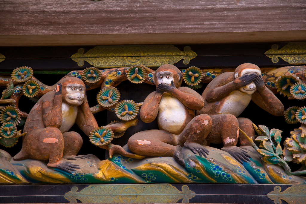 • три обезьяны (изображение трёх обезьян:) いわざる, きかざる, みざる ( не говорю, не слушаю, не смотрю, из которых одна закрывает лапами рот, другая уши, третья глаза, символизируя буддийский завет не говорить зла, не слушать зла, не смотреть на зло)